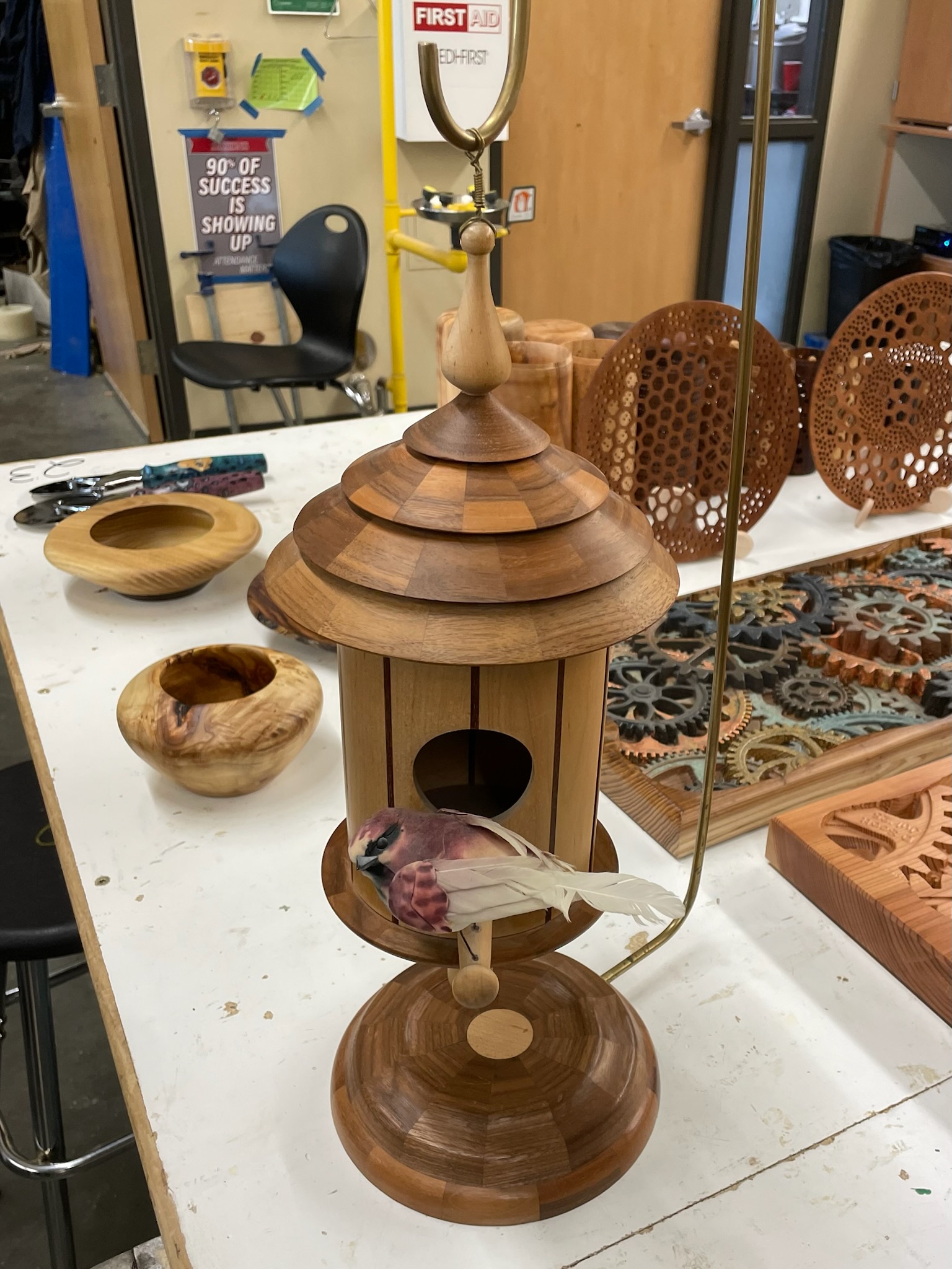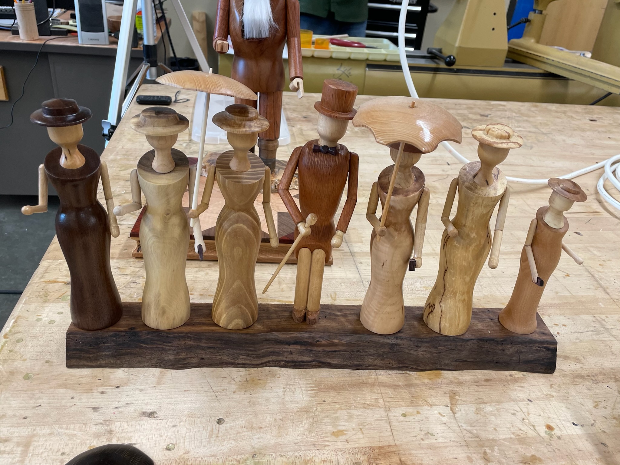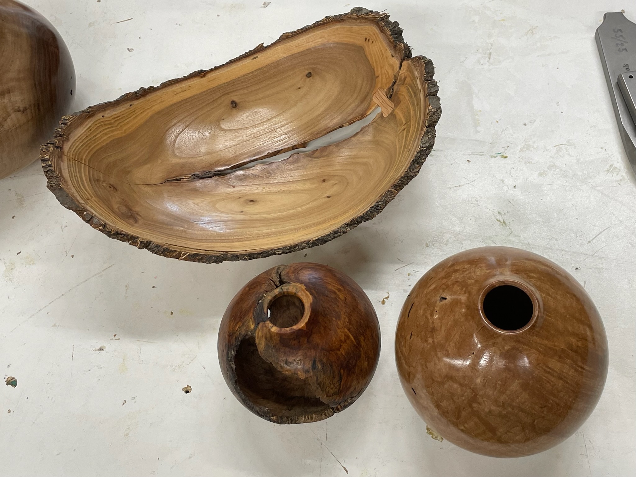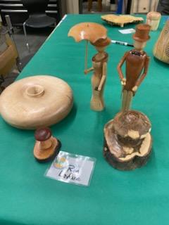 Louis Dehan turned an ornament and demonstrated how to turn a finial. I was impressed, I had never seen this done before. Now I’m a little more inclined to try it. Thanks Louis. Below are pieces displayed at the meeting.