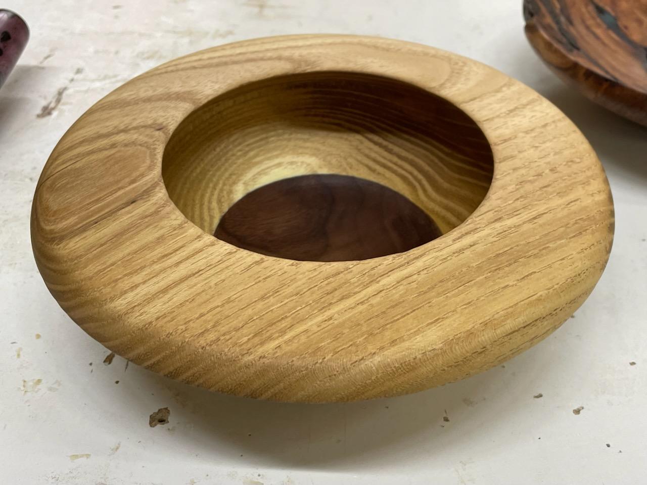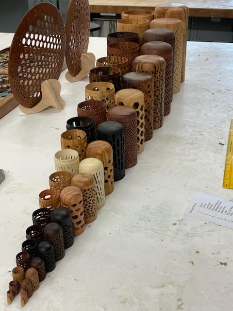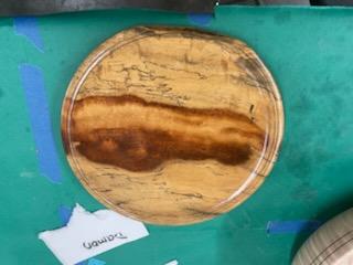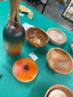 Damon presented a demonstration and discussion on his methods and materials used to embellish your turnings with dyes and various colors to include paint layering and exposure by sanding or other processes. He encouraged group members to play on their own to acquire the effect you want for the piece you turned. Below are pictures of Show and Tell.